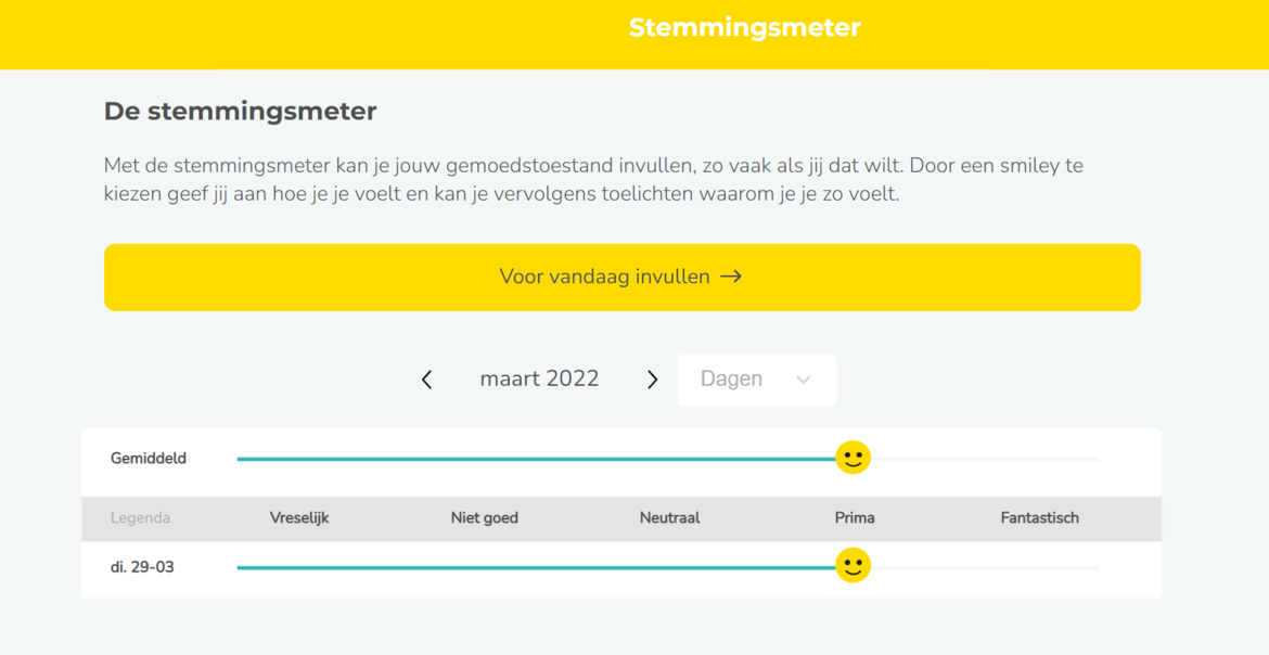 Elke dag een korte check: hoe voel je je vandaag? Hoe is je mood? Je mag dit toelichten, dit hoeft niet. Soms is er simpelweg ook geen verklaring voor en voel je je even wat minder. Dat kan en dat mag.